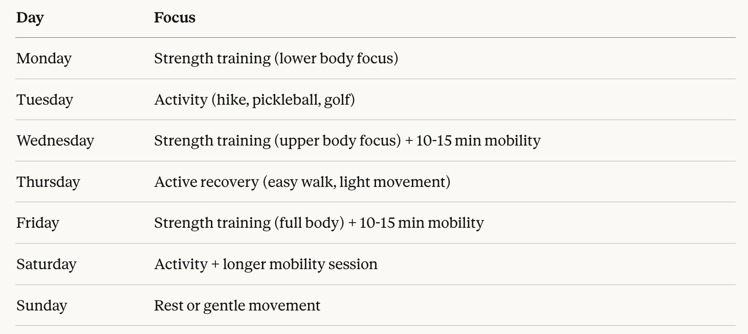 This isn't a rigid prescription — it's a framework. The specifics will vary based on your activity of choice, your current fitness level, and what your body is telling you.